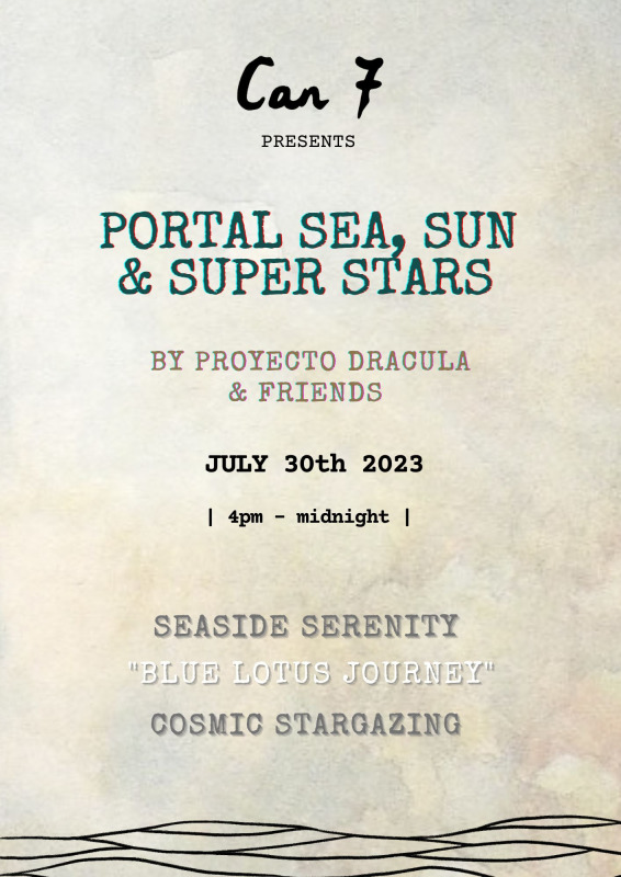 Proyecto Dracula & Friends invite you to the isle of Formentera for Portals On The Sand happening July 28- Aug 1, 2023. A group of talented artists, inspired thinkers, poets, healers, musicians, astronomers, synchronized swimmers, entrepreneurs, moonbathers, thespians and more—are gathering as an ensemble to experiment, connect, and create on the sand. Our headquarters is Can7, an artist residency/creative society on an undeveloped stretch of Playa Mitjorn beach, a UNESCO heritage site that’s perfect for swimming, connecting with nature, and relaxation. The Happening is meant as an immersive, participatory experience. You too are an artist, which is what makes this gathering particularly delightful and different from an art fair, a festival, or a party. Programming will include theater, DJ’s, live music, blue lotus sail boat cruise, cave sound journey, stargazing, improvisational fun & games, and who knows what else. All you need to bring is an open mind.